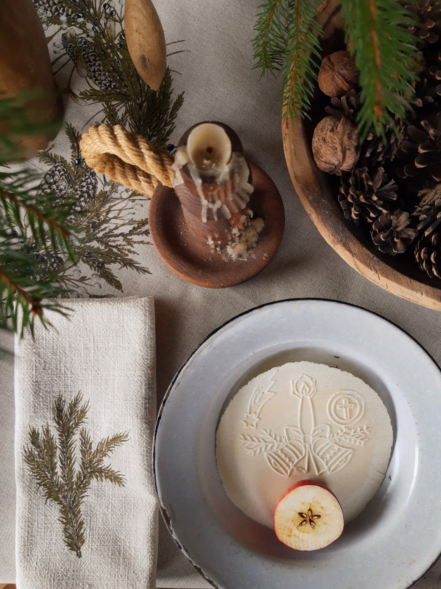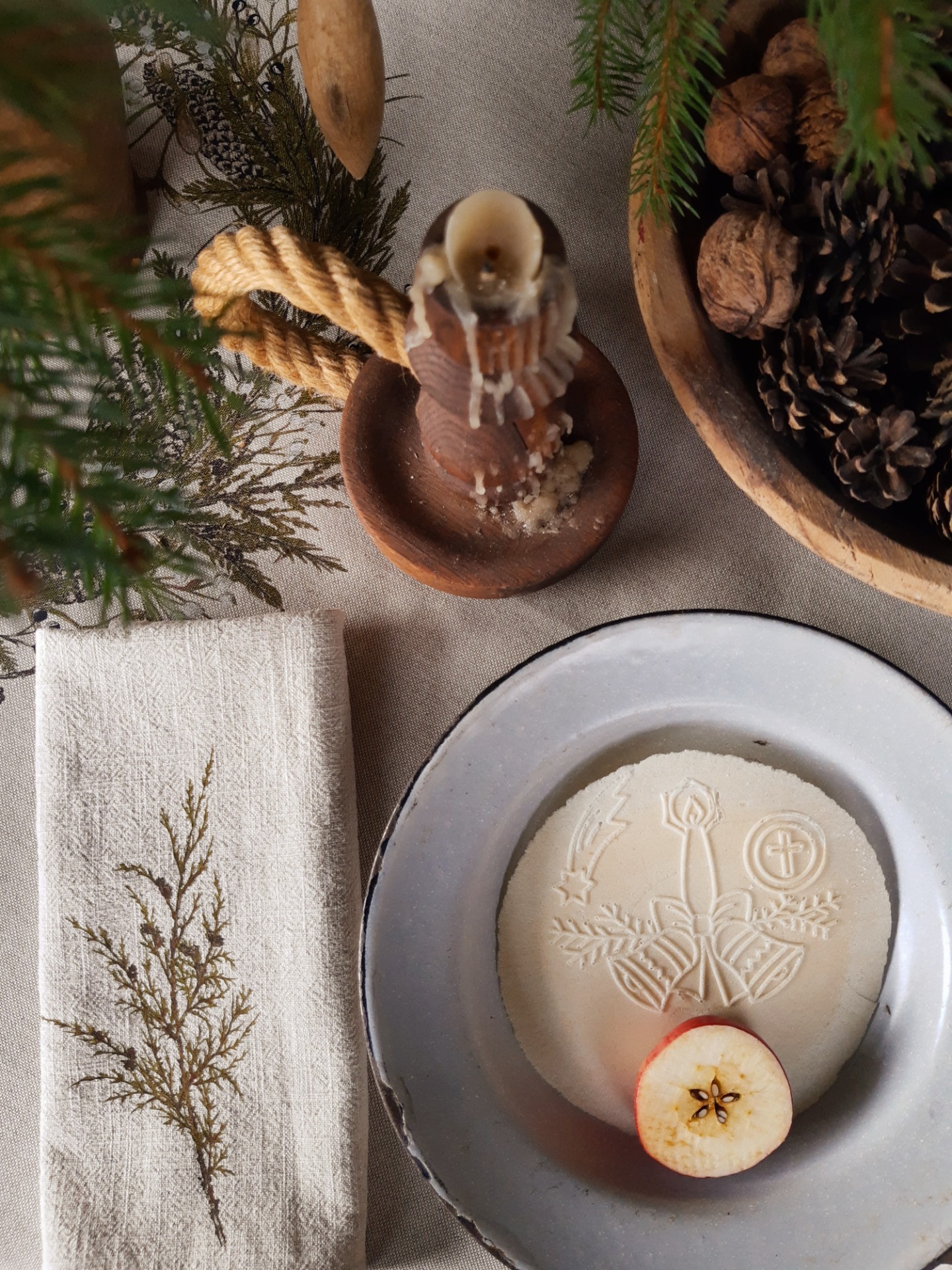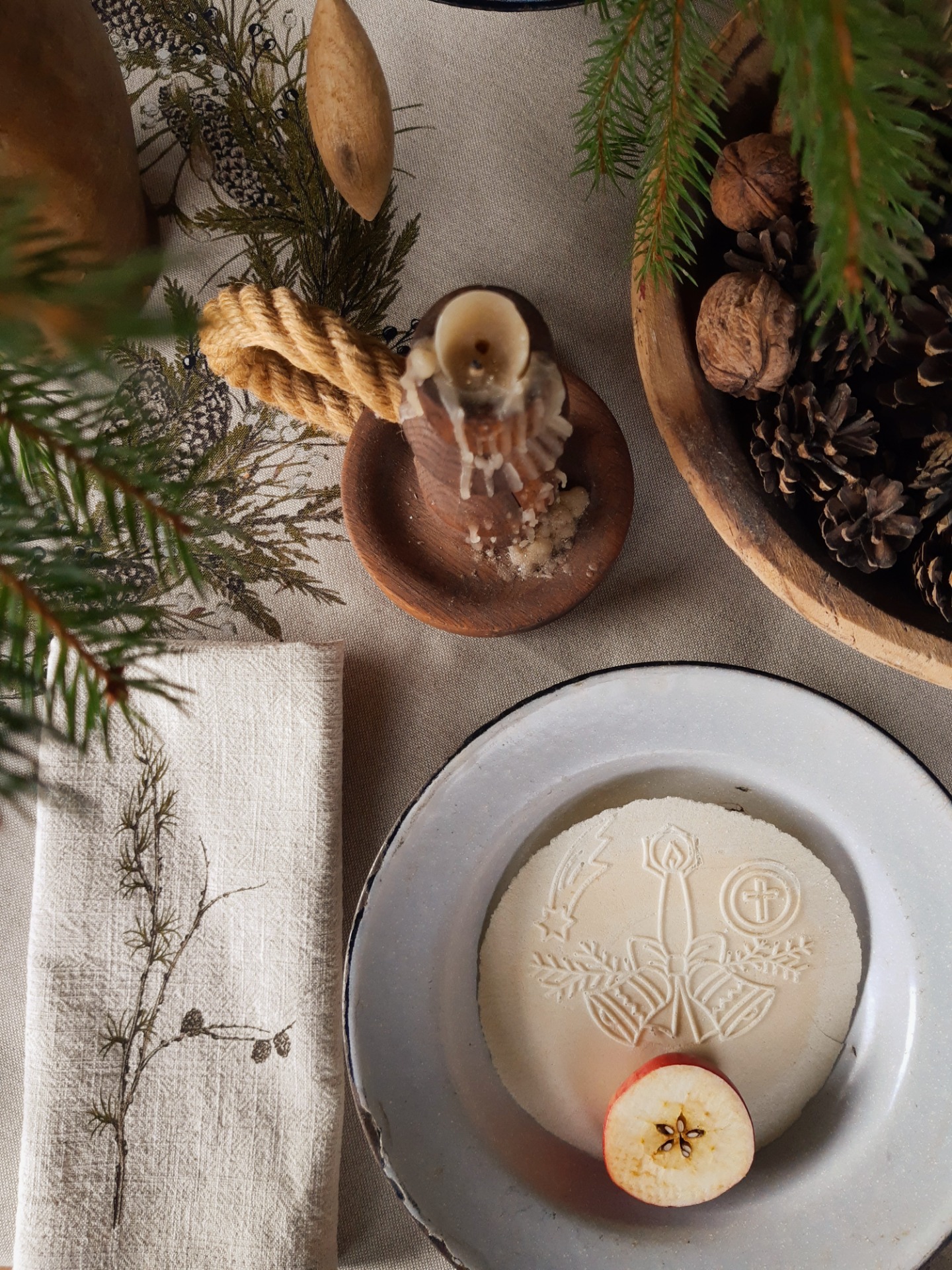 Na toto zimné prestieranie sme použili jemný, predpraný, béžový ľan s krásnou štruktúrou. Potlačené je mojimi maľbami zimných konárikov a to smrek, borovica, vtáči zob, tuja, smrekovec opadavý, imelo.