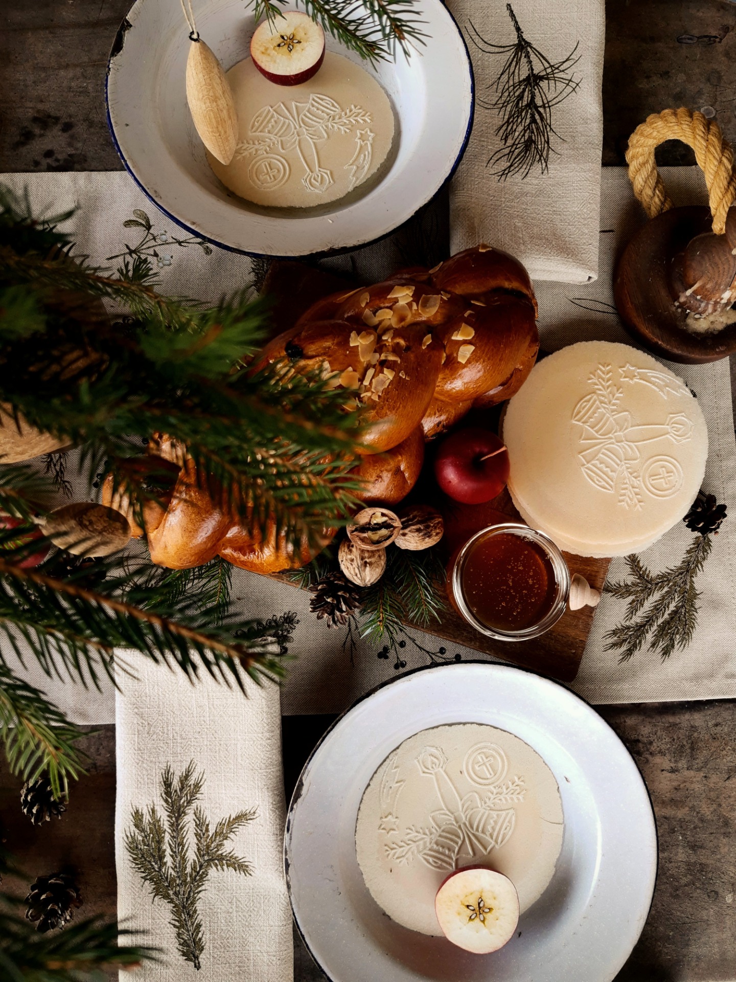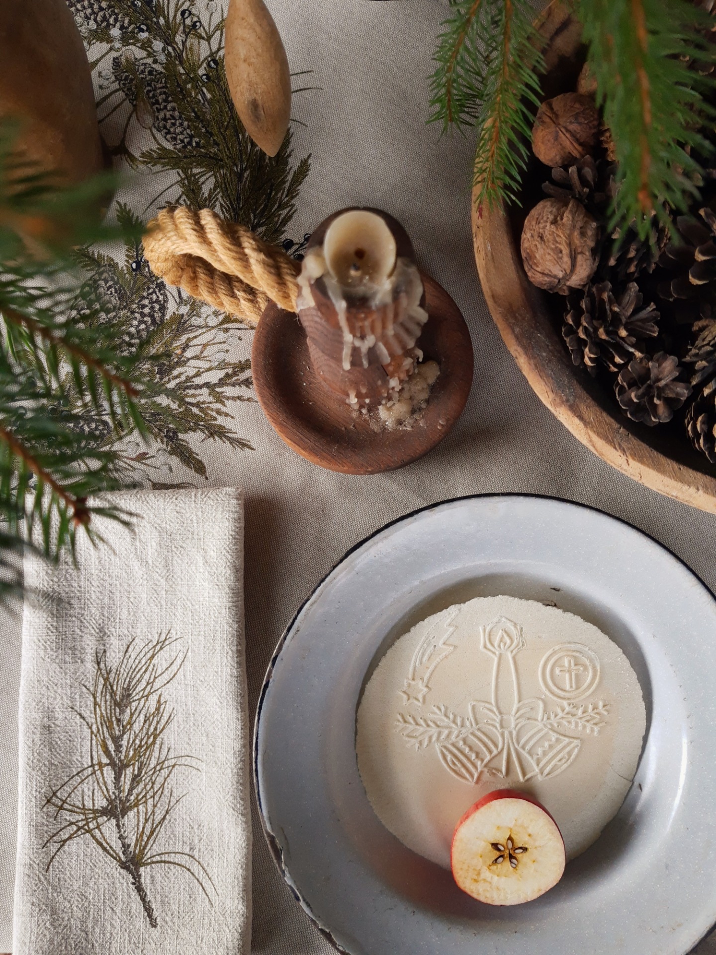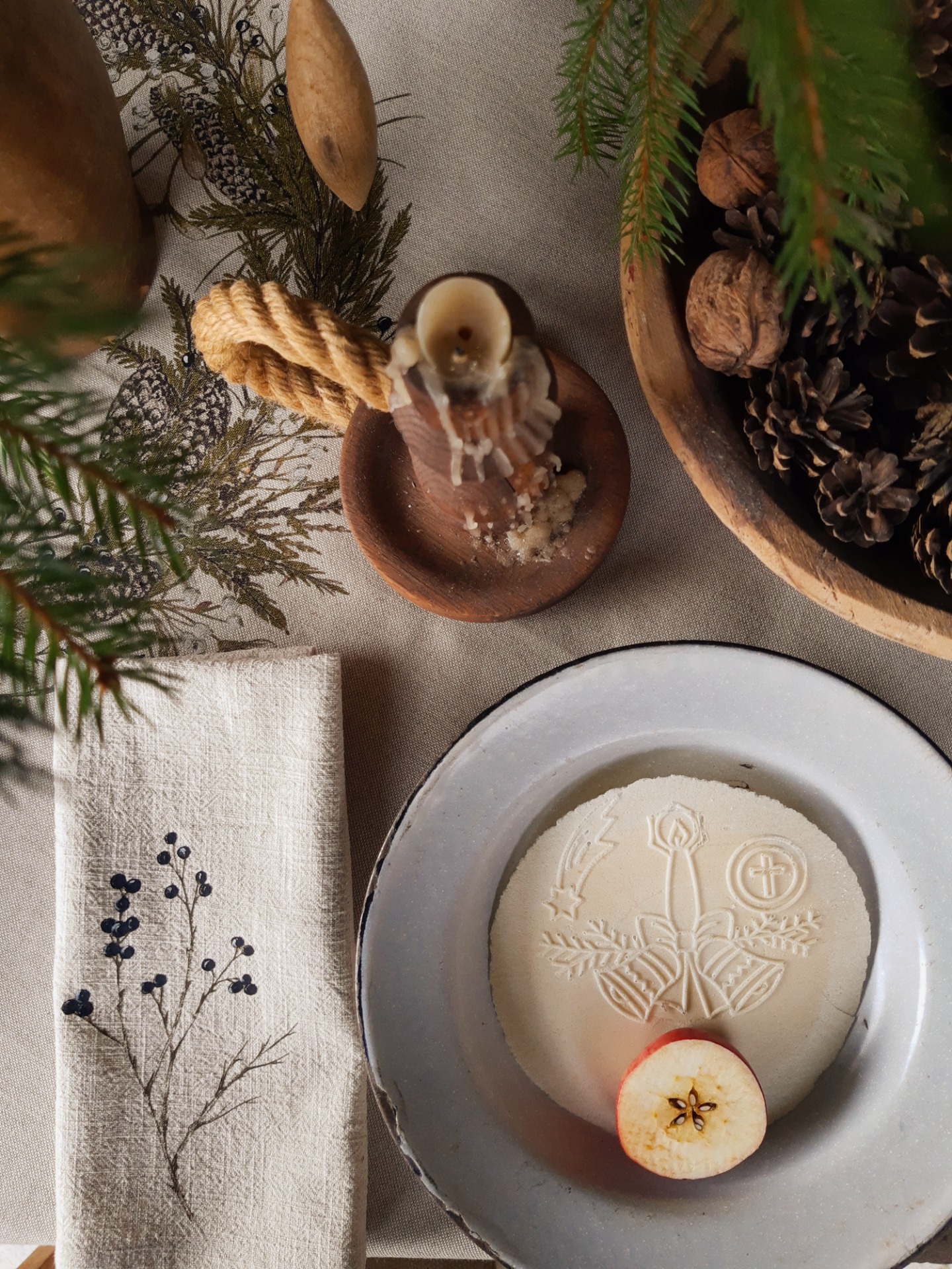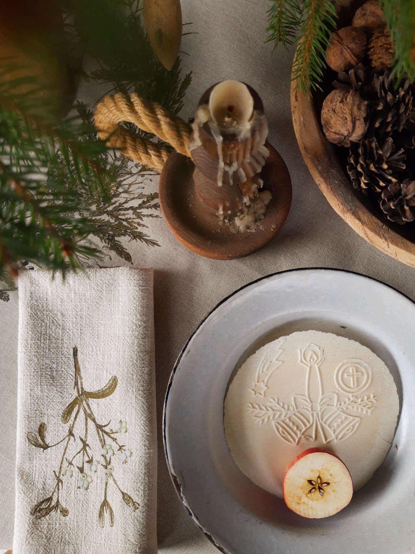 Na toto zimné prestieranie sme použili jemný, predpraný, béžový ľan s krásnou štruktúrou. Potlačené je mojimi maľbami zimných konárikov a to smrek, borovica, vtáči zob, tuja, smrekovec opadavý, imelo.