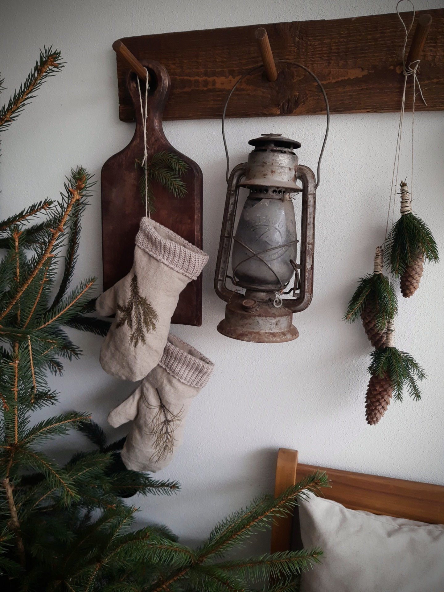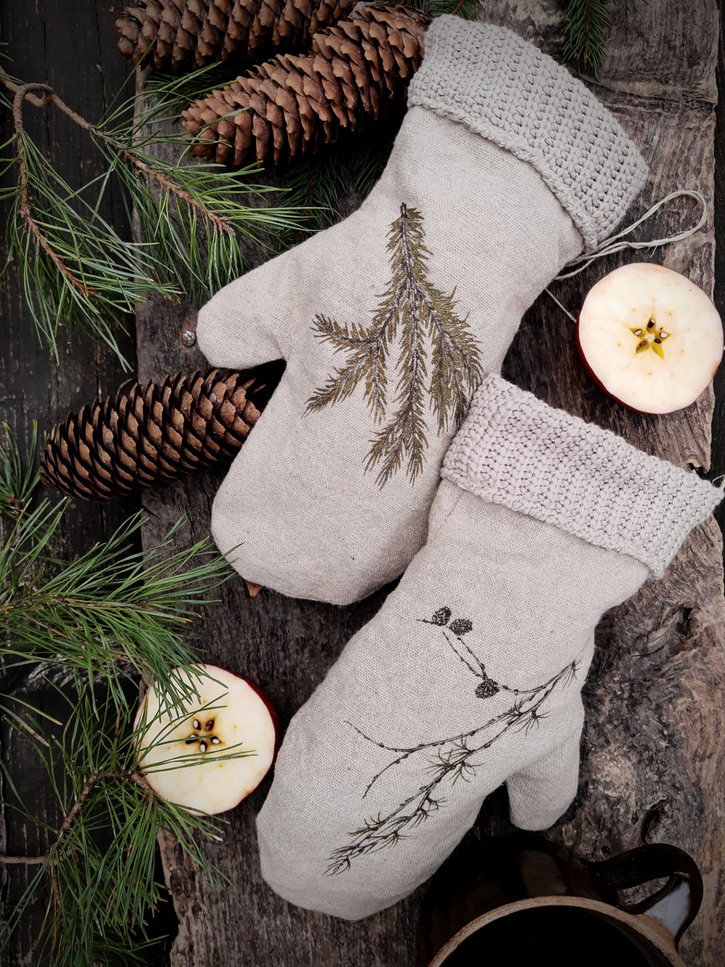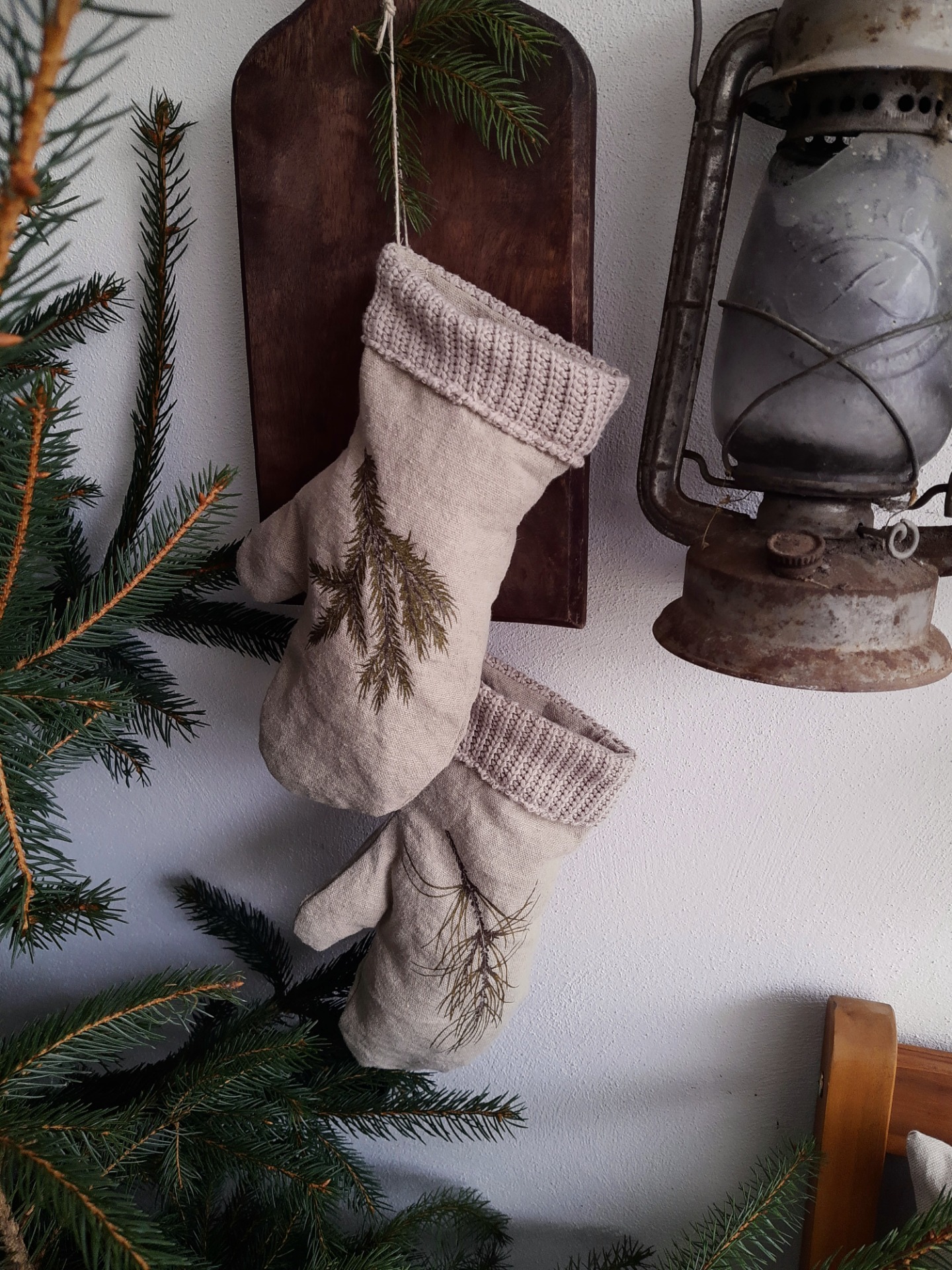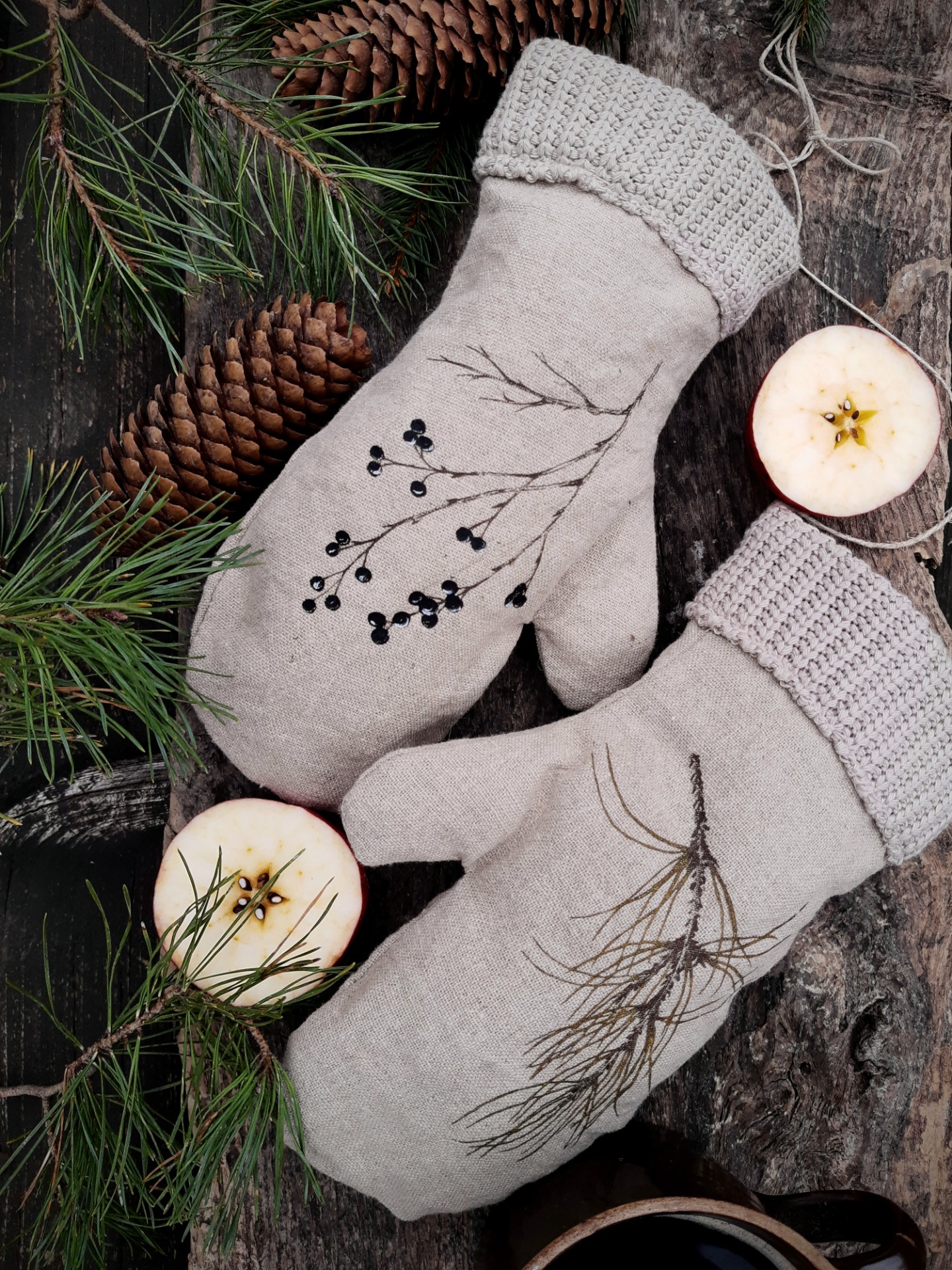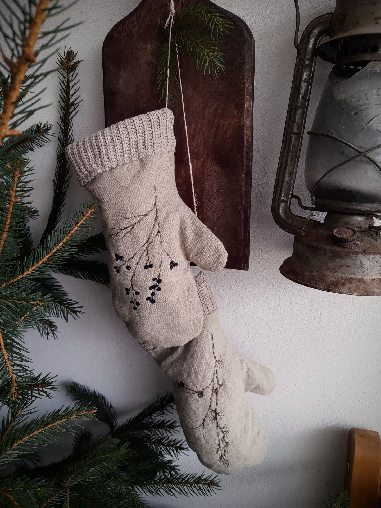 Rukavice sú prírodným doplnkom s ktorým si môžete zimne prizdobiť váš veniec na dvere, vitrínu v obývačke... Sú na ňom kresby zimných konárikov ako smrek, borovica, smrekovec opadavý a vtáči zob.