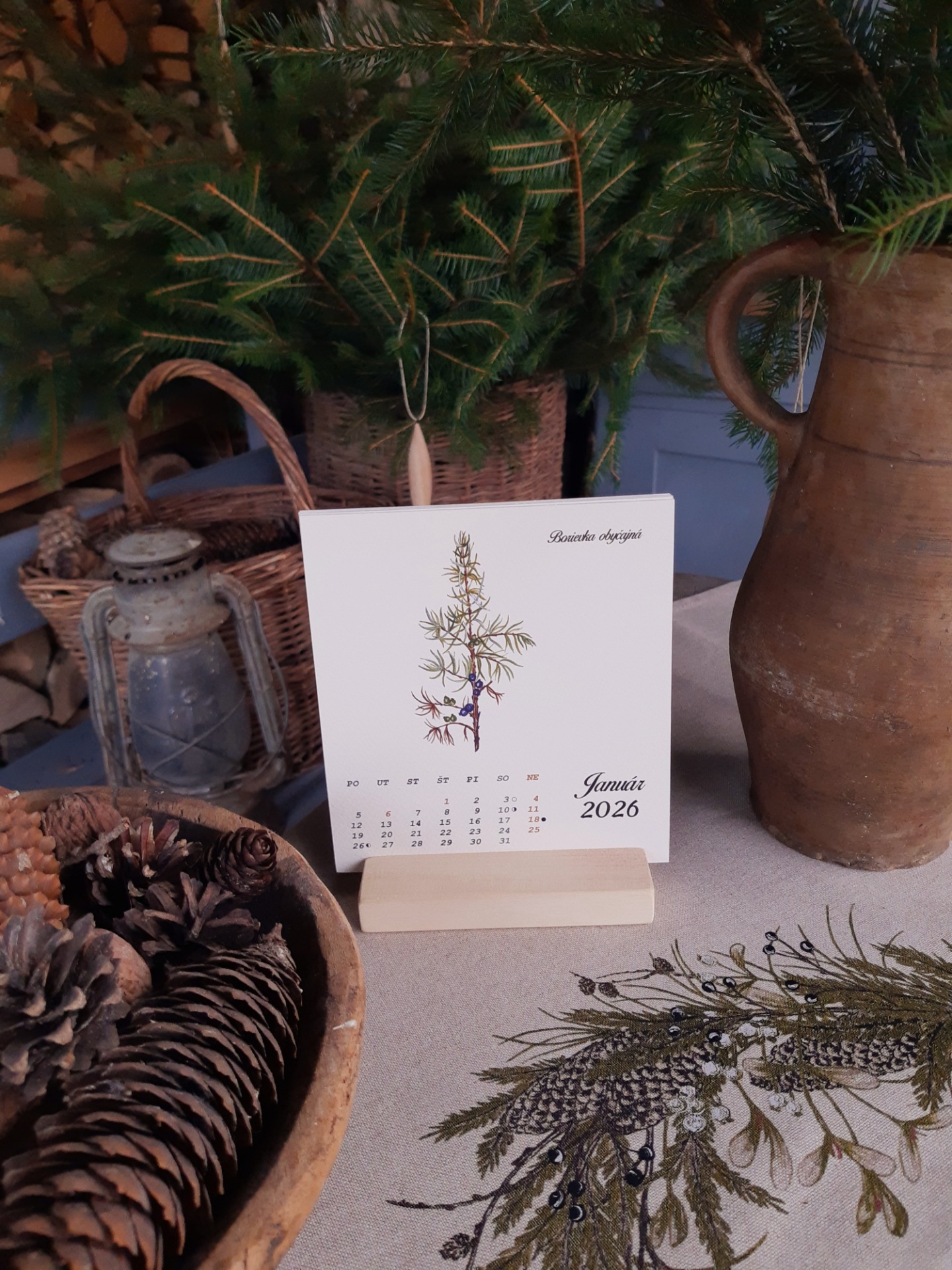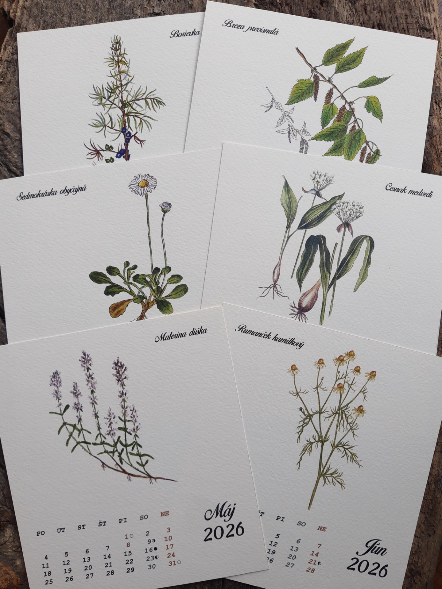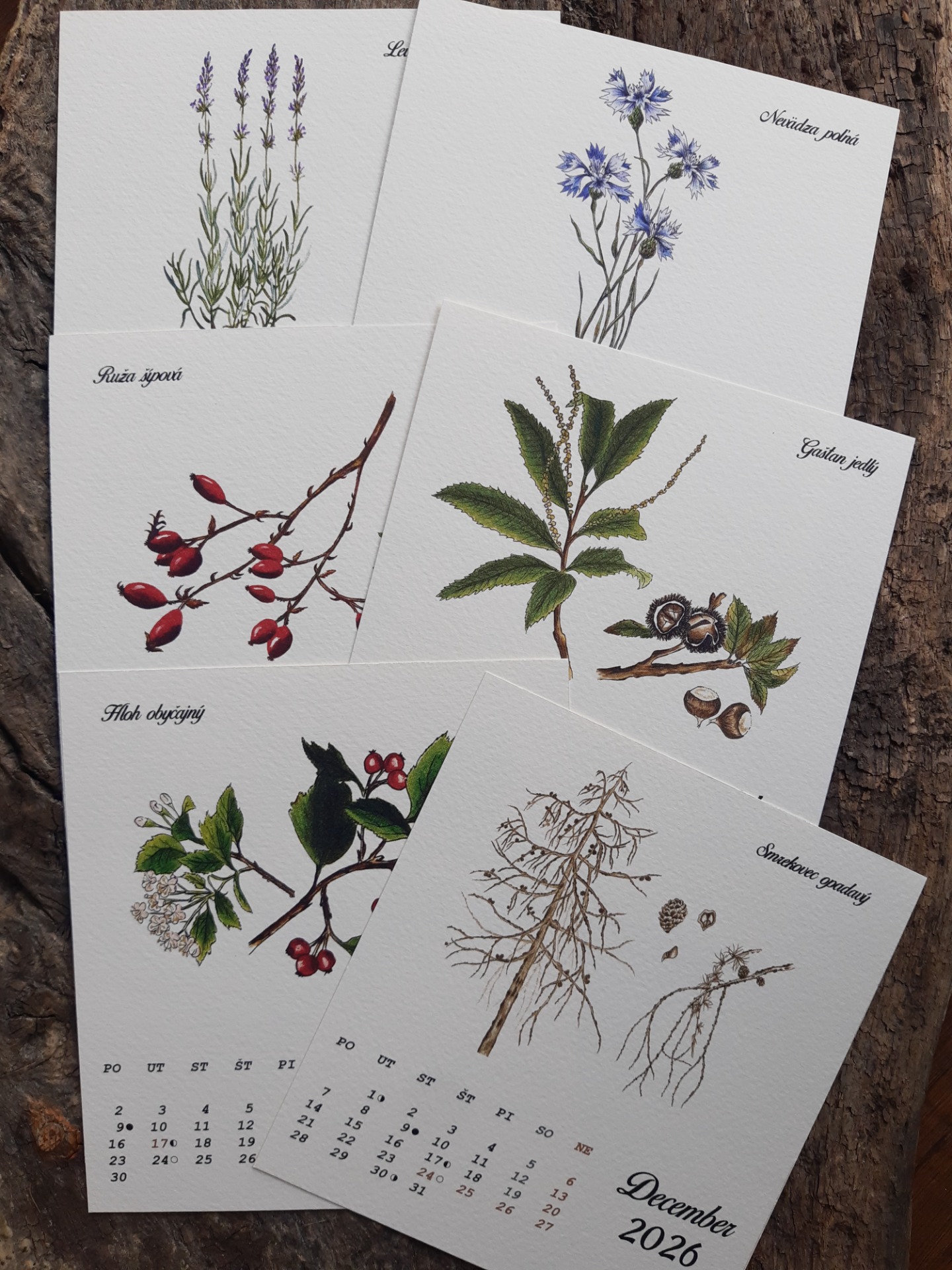 - 13kartičiek, na ktorých sú maľby tlačené na hrubom štruktúrovanom, matnom papieri maslovej farby 260gramáž. Prvá kartička titulný obrázok, plus 12ks kartičiek bylín a stromov. Borievka obyčajná, Breza previsnutá, Materina dúška, Sedmikráska obyčajná, Rumanček kamilkový, Cesnak medvedí, Levanduľa lekárska, Ruža šípová, Nevädza poľná, Gaštan jedlý, Hloh obyčajný, Smrekovec opadavý. Rozmer papiera: 16x14,50cm