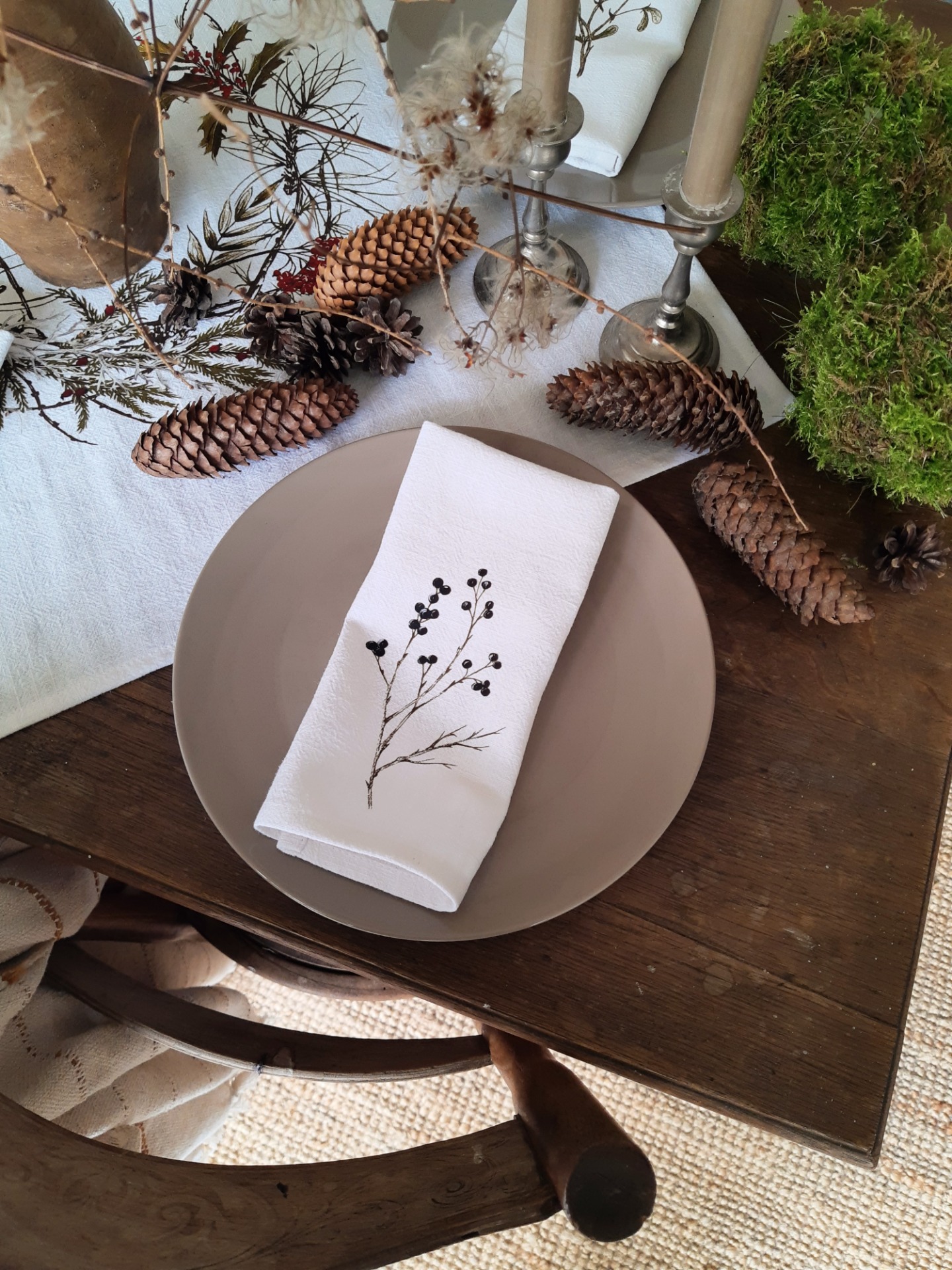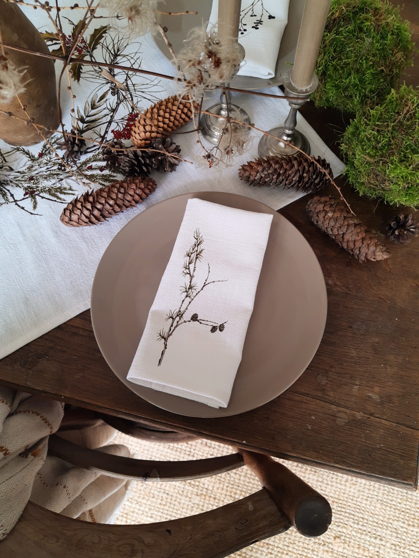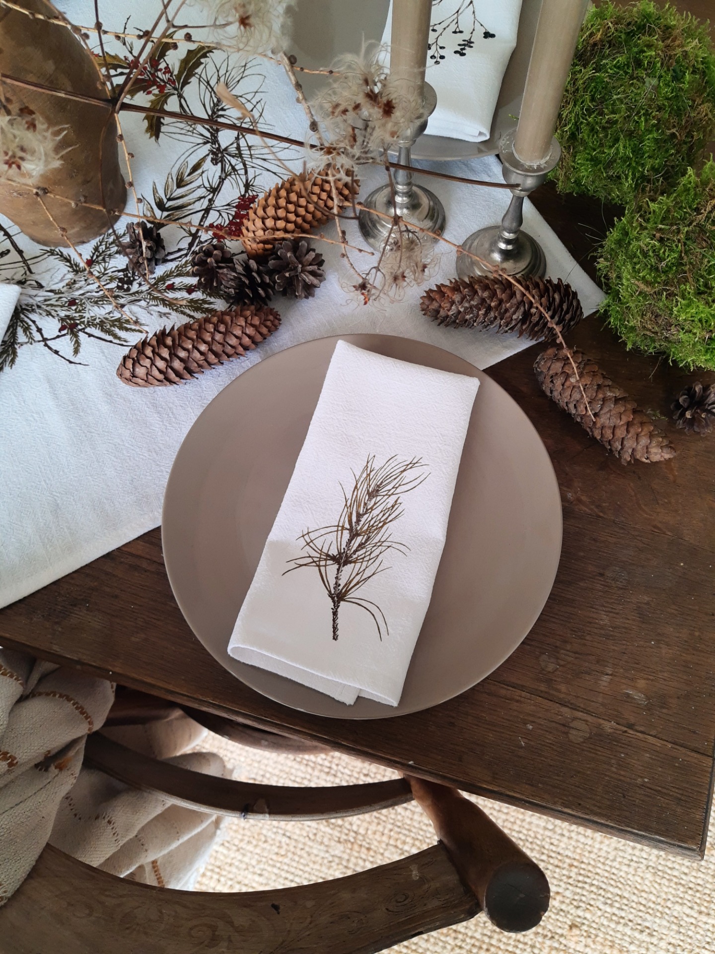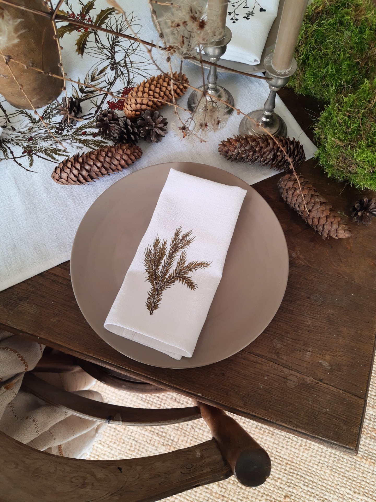 Toto ľanové prestieranie sme vytvorili na dokombinovanie k našim zimným obrusom a štólam z bieleho ľanu. Odtieň zelenej je prispôsobený tak, aby vám spolu krásne ladili.