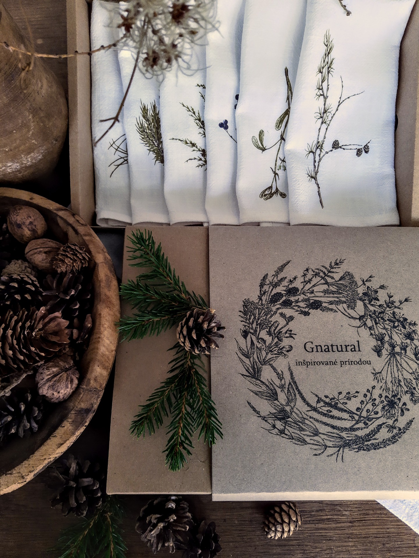Darčeková krabička je natur farby. Cez krabičku je navlečený prebal z recyklovaného papieru. Sú na ňom potlačené bylinky, ktoré som maľovala. Do krabičky sa vojde napr. dva vankúše, štóla a vankúš...