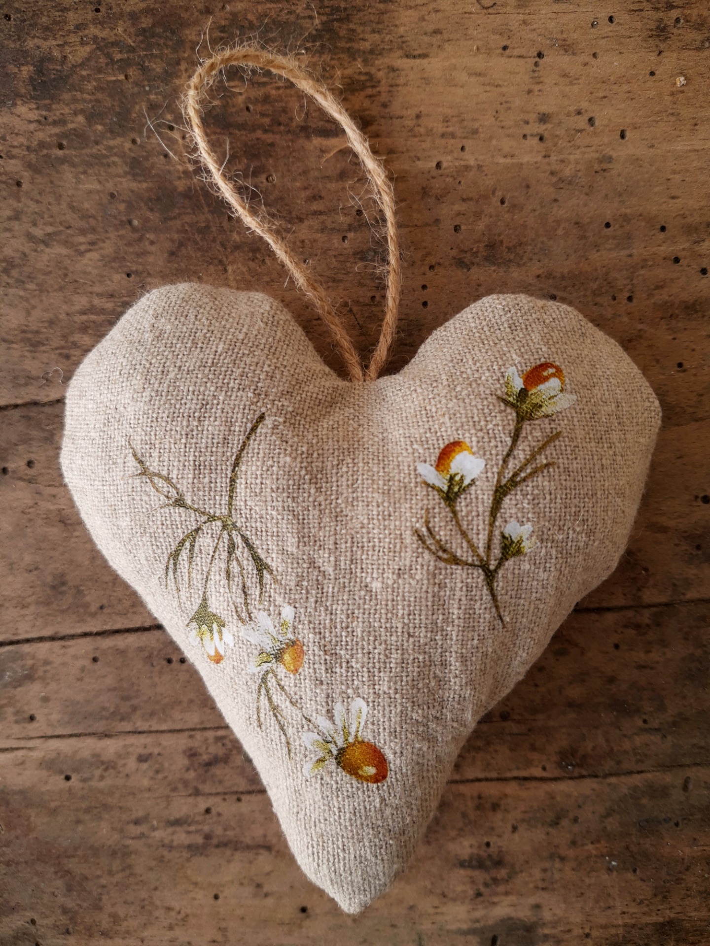 Ľanové srdiečko je vyrobené zo surového ľanu, je na ňom potlač mojej maľby kamiliek. Potlač je iba z prednej strany. Dá sa zavesiť za jutový špagát.