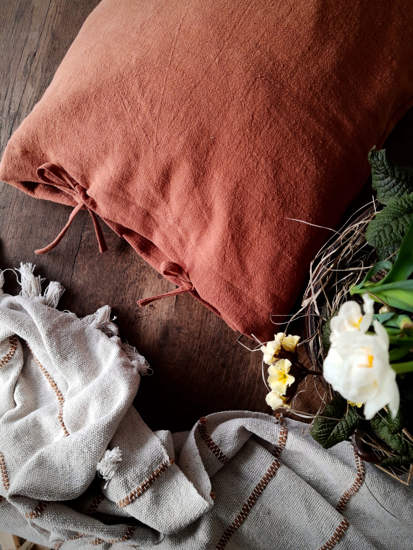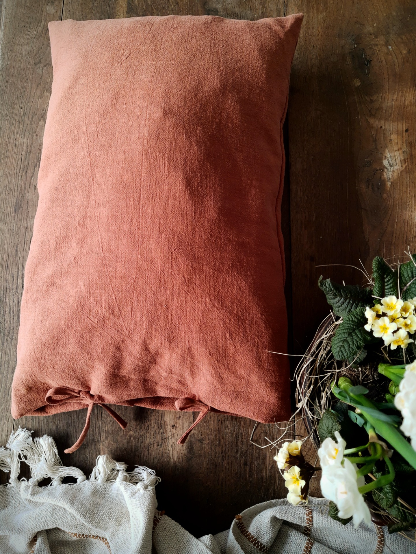 Ľanový návlek na vankúš farby terracotta, ktorý je krásny na kombinovanie s ostatnými vankúšmi. Ľan je predpraný, veľmi jemný a príjemný na dotyk.