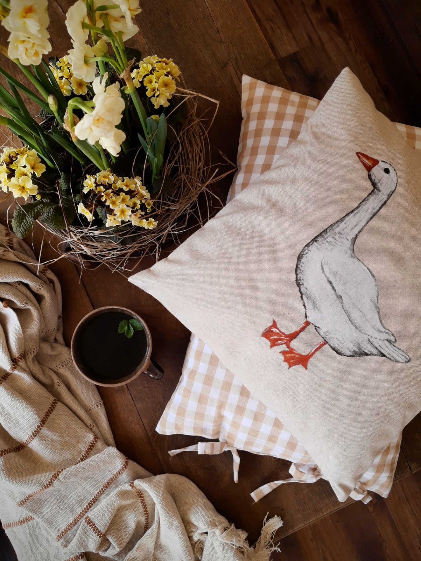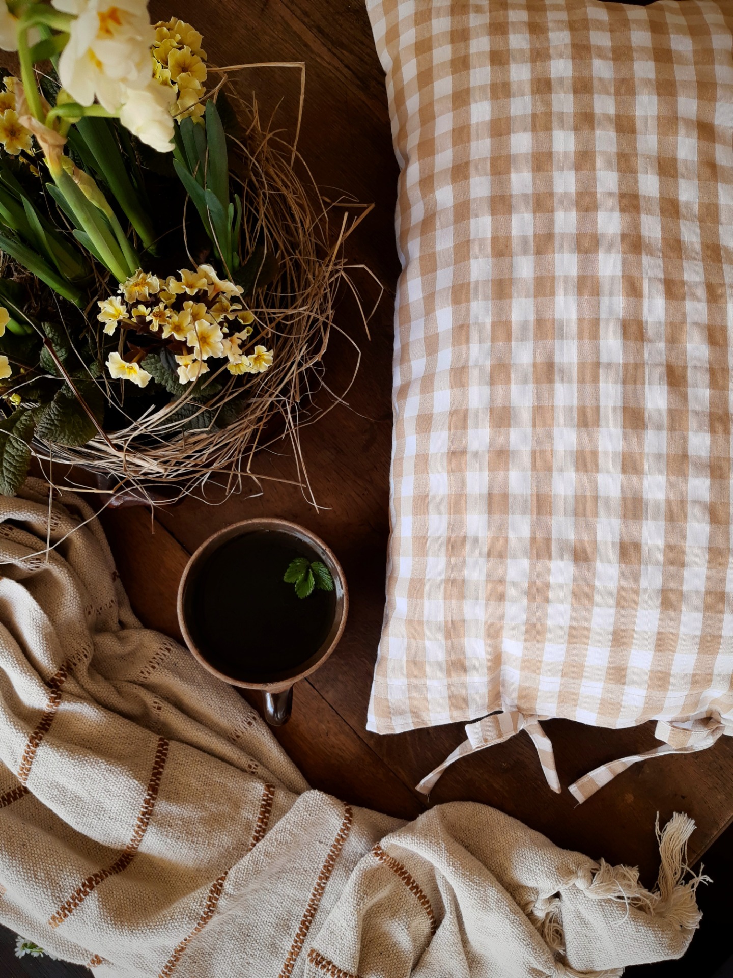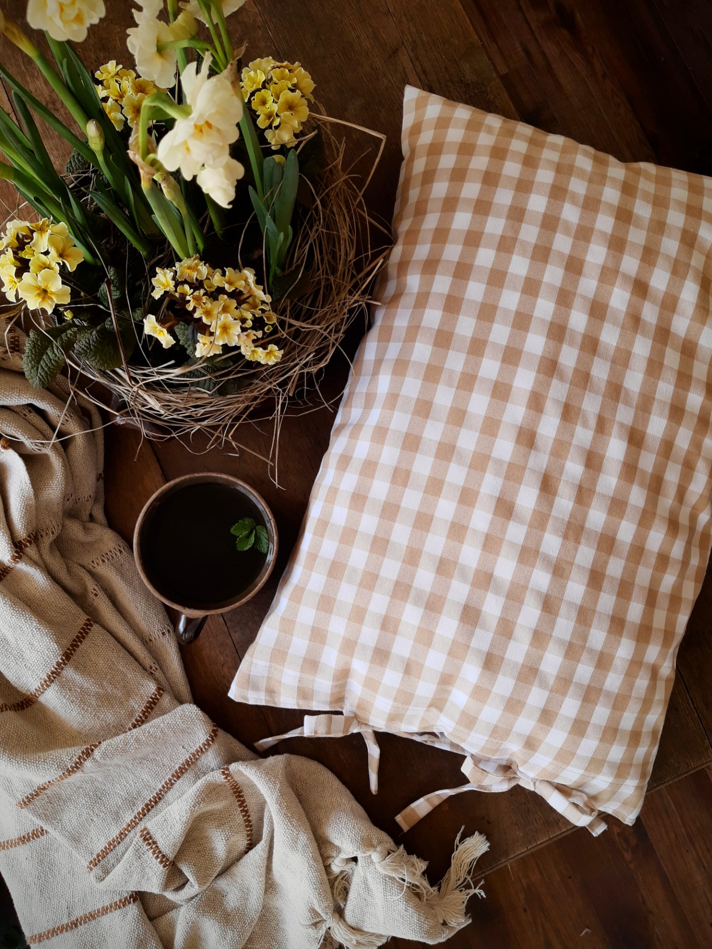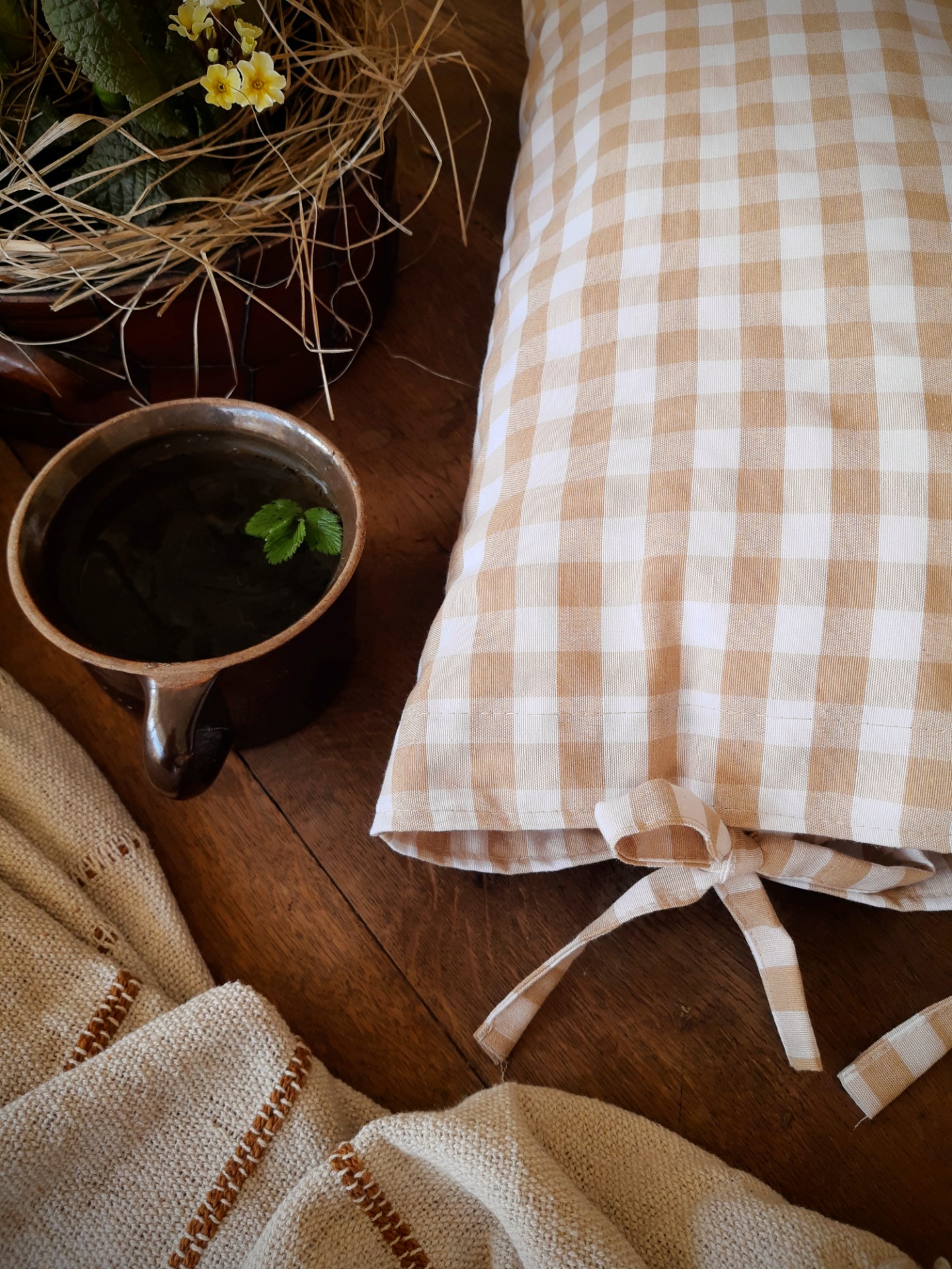 Návlek na vankúš je ušitý z látky, ktorá má vzor béžové káro. Je to látka, ktorá pôsobí vzdušne a jemne, preto vie dodať do priestoru ľahký a svieži, jarno-letný nádych vidieka.